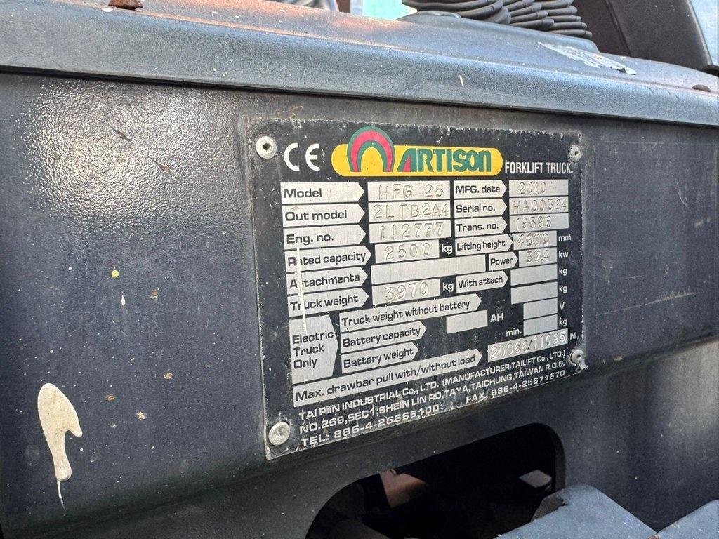 Lot 10: ARTISAN Model HFG25 2500KG Capacity Gas Forklift Truck. Year 2010 Number of watchers: 2