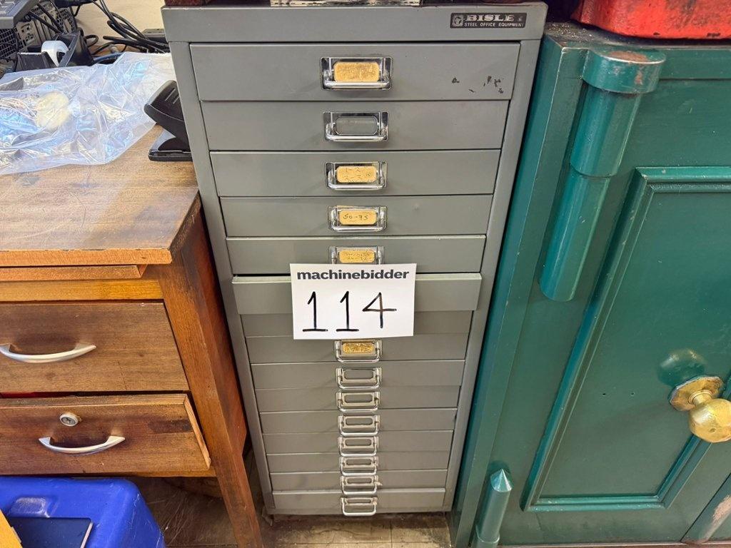 Lot 114: BISLEY 15 Drawer Cabinet containing qty of Measuring Equipment Number of watchers: 1