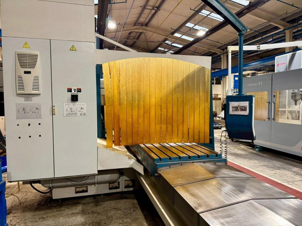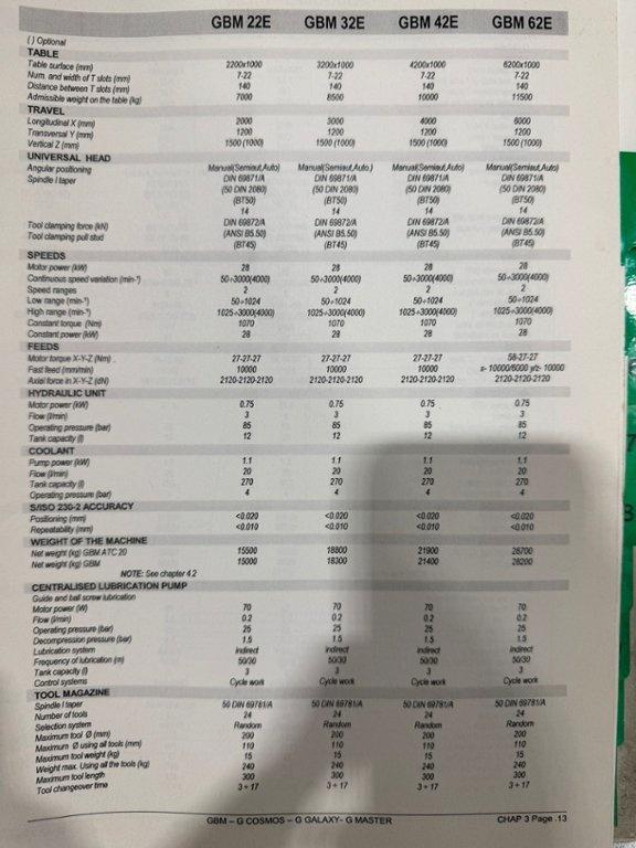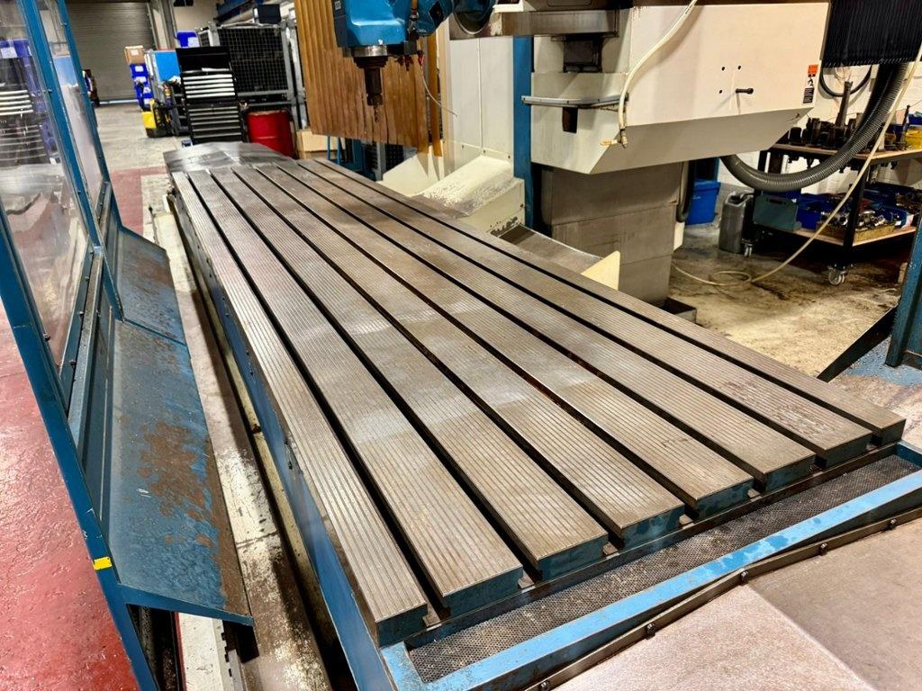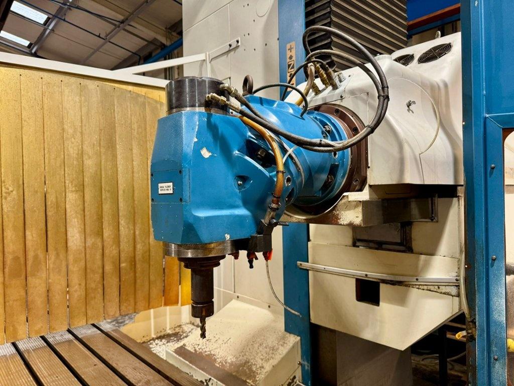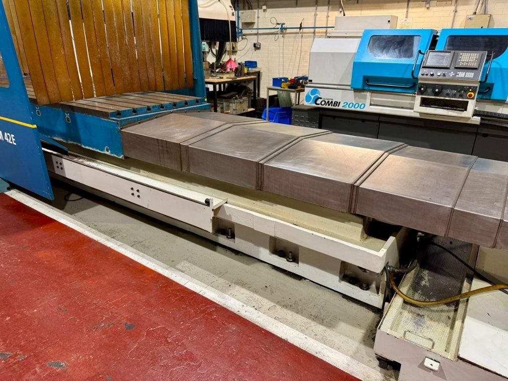 Table size 4200mm x 1000mm. Longitudinal travel 4000mm. Cross traverse 1200mm. Vertical traverse 1500mm. Maximum weight on table 10000 kg. Spindle taper 50 ISO. Maximum speed range 3000 rpm. Main motor power 28 kW. Rapids 10m/min. Heidenhain TNC530 Control. Manual toolchange. Manual indexing head. Coolant. Overall dimensions L x W x H 9820mm x 6000mm x 3752mm. Approximate weight 21,600 kg