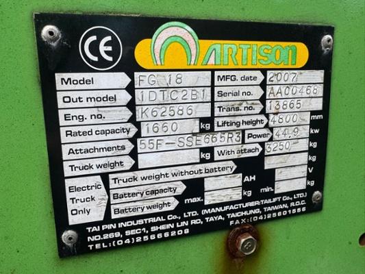 Lot 6: ARTISON Model FG18 1800KG Capacity Gas Forklift Truck. Year 2007