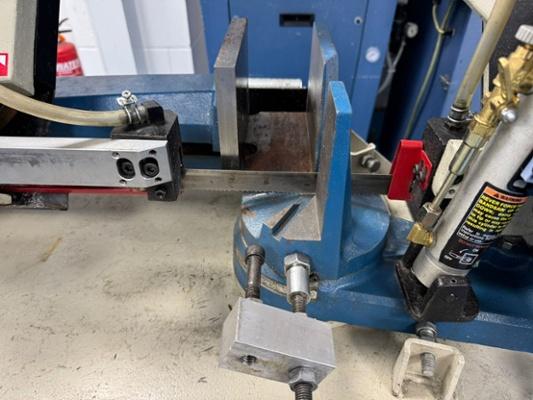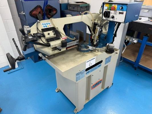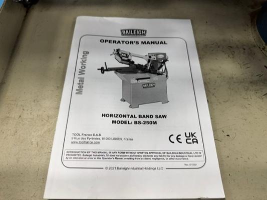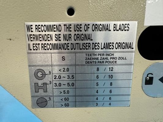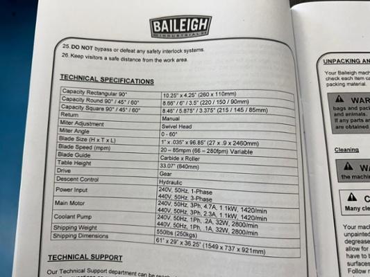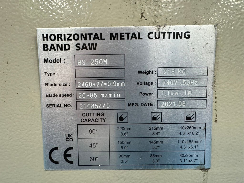 Single Phase (240V). Blade size 2460mm x 27mm x 0.9mm. Capacity (Rectangular) 90° 260mm x 110mm. (Rounds) 90° 220mm dia. (Square) 90° 215mm x 215mm. Mitre cutting 0-60°. Variable blade speed 20-85m/min. Coolant pump. Machine Serial No.21085440. Machine dimensions 1500mm x 700mm x 900mm. Approximate weight 250 kg.