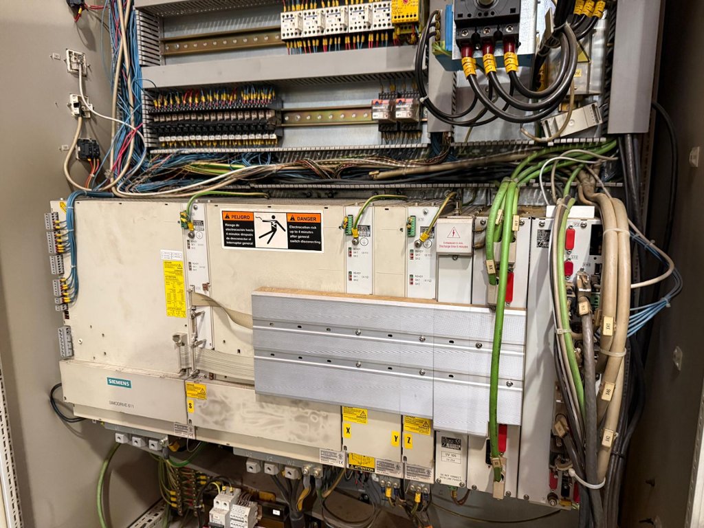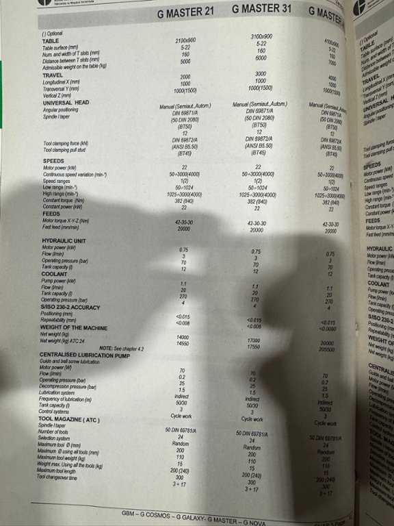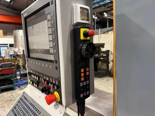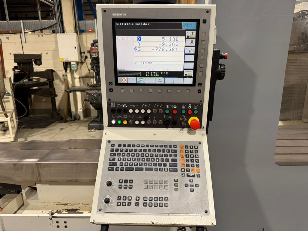 Table size 3100mm x 900mm. Longitudinal travel 3000mm. Cross traverse 1000mm. Vertical traverse 1500mm. Maximum weight on table 6000 kg. Spindle taper 50 ISO. Maximum speed range 3000 rpm. Main motor power 22 kW. Rapids 20m/min. Heidenhain TNC530 Control. Manual toolchange. Manual indexing head. Coolant. Overall dimensions L x W x H 8090mm x 4728mm x 3770mm. Approximate weight 17,000 kg