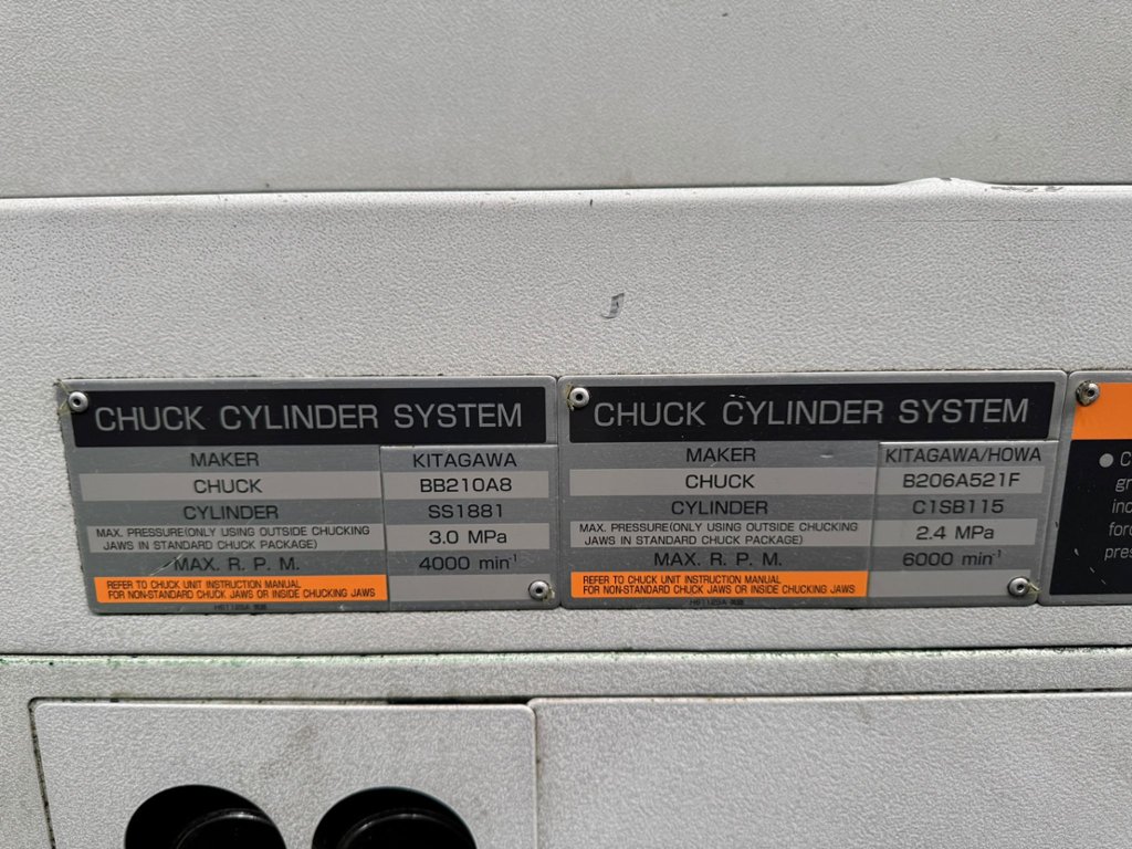 Main spindle: Spindle nose A2-8. Maximum turning dia. 366mm. Spindle speeds 4000 rpm. C Axis indexing 0.001°. Maximum bar capacity 80mm. Spindle power 18.5kW. Sub Spindle: Spindle nose A2-5. Maximum turning dia. 190mm. Spindle speeds 6000 rpm. C Axis indexing 0.001°. Maximum bar capacity 51mm. Spindle power 11kW. Travel 760mm. Turret: No.of positions 12. No of driven positions 12. X/Z stroke 260mm/795mm. Live tool speeds 6000 rpm. Live tools power 5.5 kW. Hydrafeed Multifeed arfeed MX-1B. Swarf conveyor. MSX-850BM MAPPS III Control. Serial No. NL251GH3402. Year 2007. - Machine dimensions: 4414mm x 2370mm x 2115 mm. Approximate weight 6200 kg.