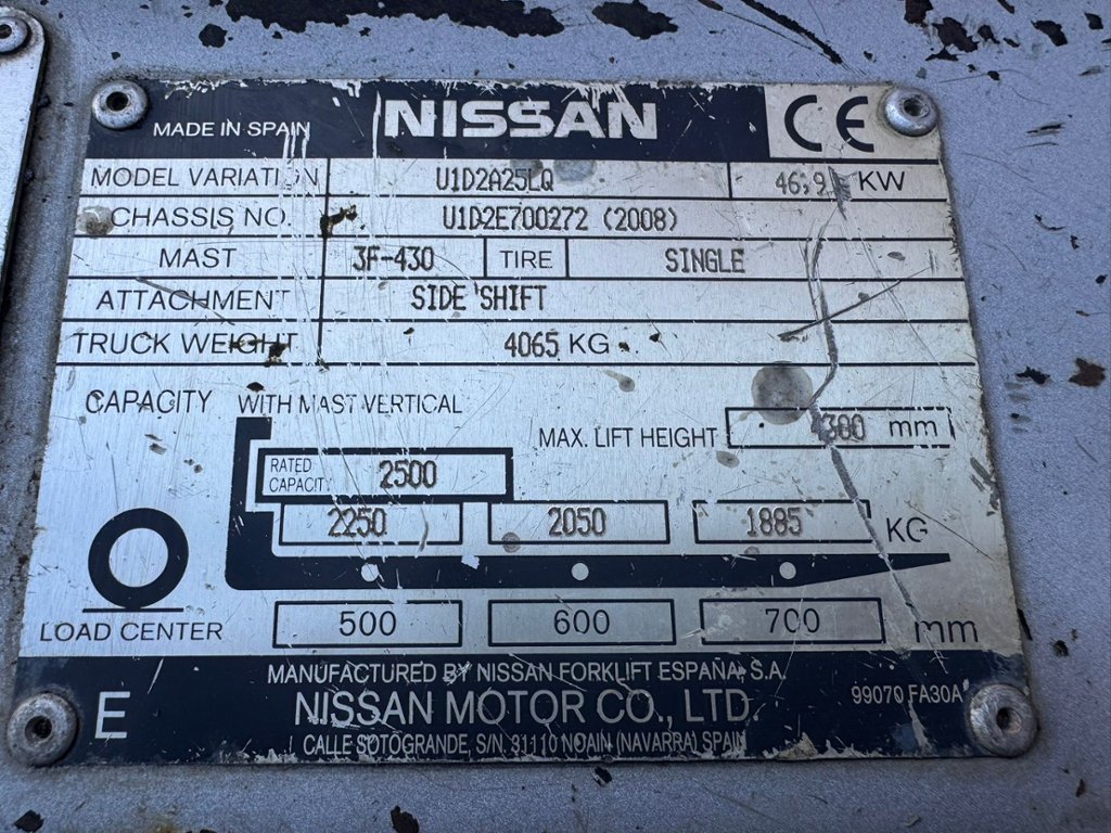 Lot 7: NISSAN Model U1D2A25LQ 2500KG Capacity Gas Forklift Truck. Year 2008