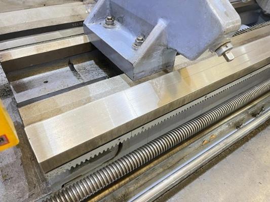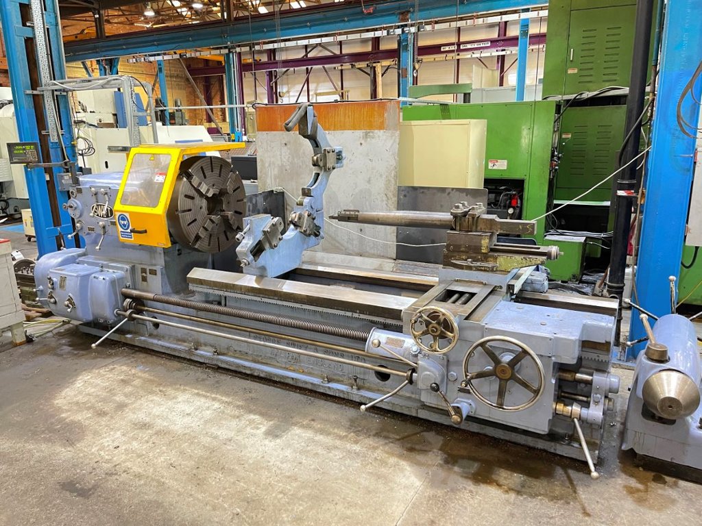 Swing over bed 32”. Swing over cross slide 24”. Swing in gap 64”. Distance between centres 80”. Spindle speeds 2.2 – 535 rpm. Spindle bore 4.3/16”. Width of bedways 30”. 31.1/2” 4 jaw chuck. Tailstock taper 6MT. 16” dia. capacity 3 point roller steady. 3 way toolpost. Additional boring bar toolpost. Interlocked chuck guard. Machine dimensions L x W x H 180” x 78” x 86” high. Approximate weight 10,000 kg