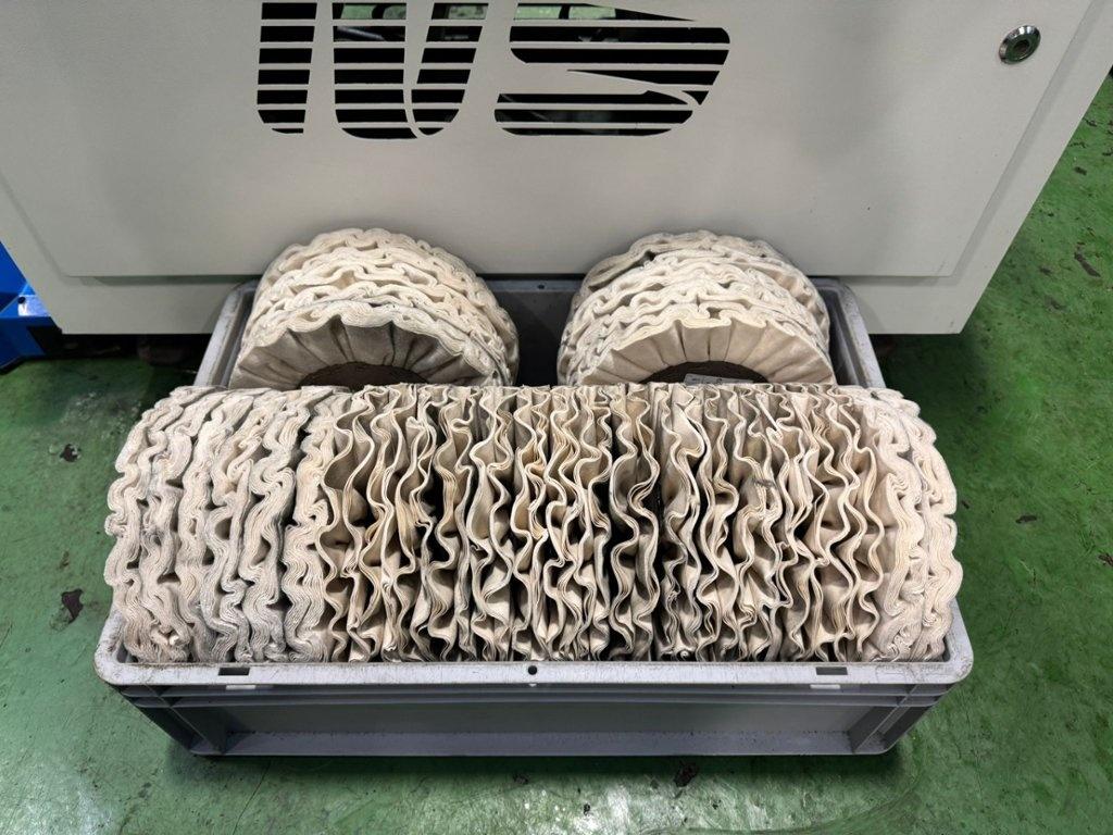 Working Capacity (mm) 40mm -114mm dia. Feeding Speed 0-3 metres/min. Polishing Wheels Speed up to 35 metres/sec. Polishing Wheels Dimensions (3x) (2x) 180mm-240mm dia. Polishing Wheels Motor (kW) 5,5. Wheel Motor (kW) 0,37. Consumption 22 amp. MP100 round tube machine mirror polishes round tubes, straight or curved. Three planetary polishing wheels rotate around the tube making high pressure and delivering a high gloss mirror polishing. The machine features brushes pressure control by foot pedal. This enables the operator to control the applied force during tube polishing operation. The automatic feeding system transports straight tubes safely through the polishing units, enabling a consistent and high mirror polishing quality. Machine Dimensions L x W x H 1250mm x1250mm x1550mm. Weight approx 420kgs.