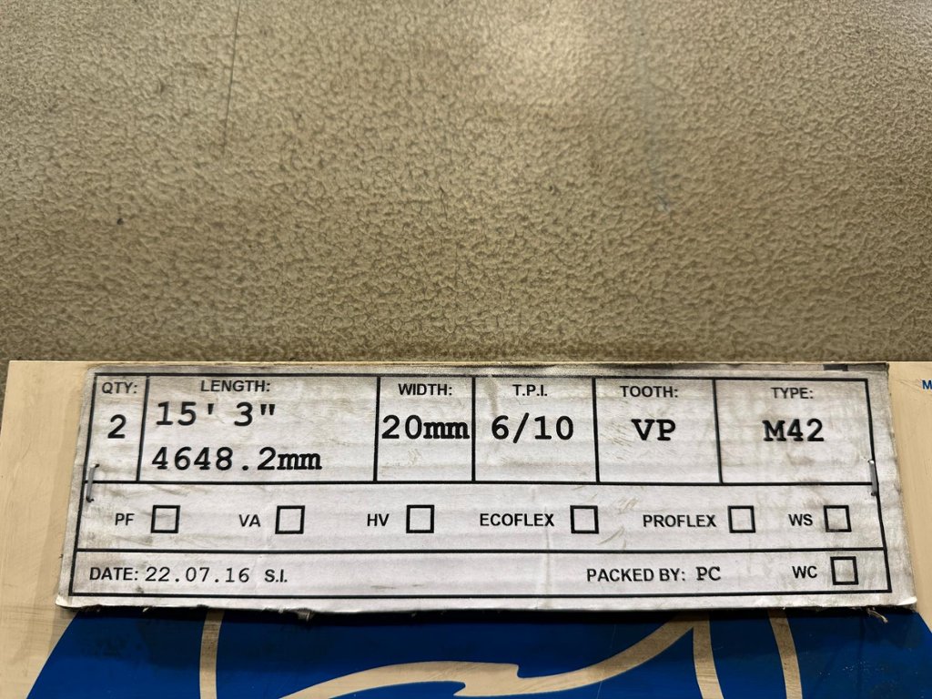 Table size 26'' x 26''. Throat depth 36''. Speeds 50 - 3600 feet per minute. Blade size 183'' x 0.787''. Blade welder & grinder.Overall dimensions 75'' x 44'' x 65'' x 83'' high. Approximate weight 400kg.