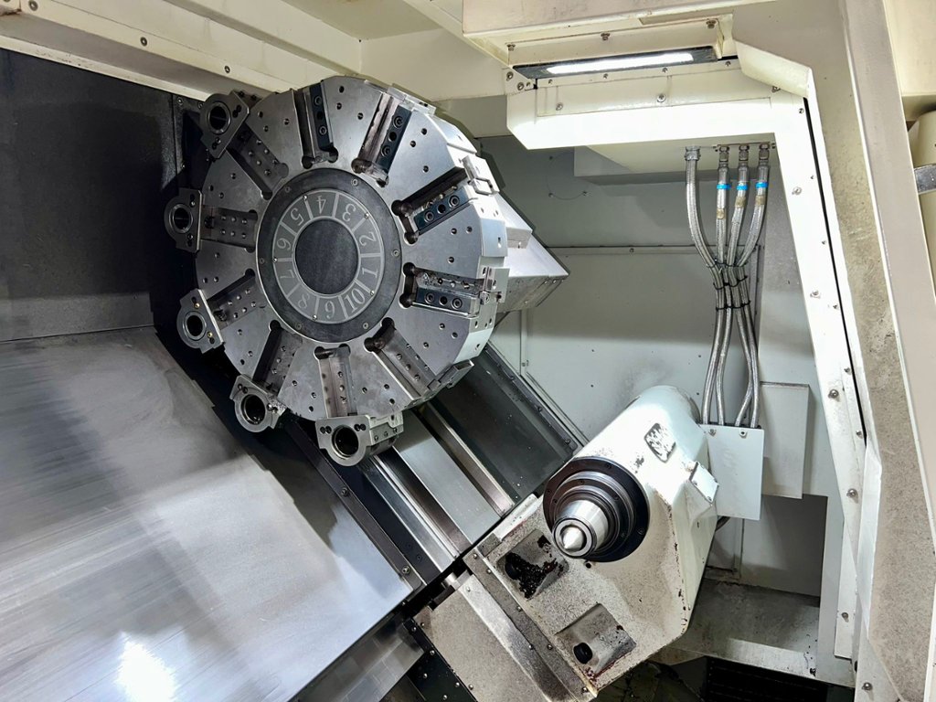 Swing over bed 780mm. Standard turning dia. 520mm. Maximum turning dia. 620mm. Swing over carriage 620mm. Distance between centres 1325mm. X/Z Axis travel 310+30mm/1250mm. Spindle bore 135mm. Bar capacity 117.5mm. Rapids X/Z 24/24m/min. X/Z Feed motors 4/4kW. X/Z Ball screw dia. x pitch 36mm x P8/50mm x P10. Maximum spindle speed 2000 rpm. Spindle motor power geared ( Cont/30min/15min) 30/37/45 kW. Spindle nose A2-11''. 10 station turret. Tailstock quill dia. 150mm. Quill stroke 150mm. Quill taper 5MT. Total power requirement 50 kVA. Coolant tank capacity 600 litres. Machine is fitted with a 381mm dia. 3 jaw chuck. 3 Point Open Ended Steady 30mm-300mm capacity. Approximate machine size 5300mm x 2700mm x 2200mm high. Approximate weight 12,700 kg. Fanuc Series 0i-TF Control. Machine Serial No. HS5 -1130. Year 2018.